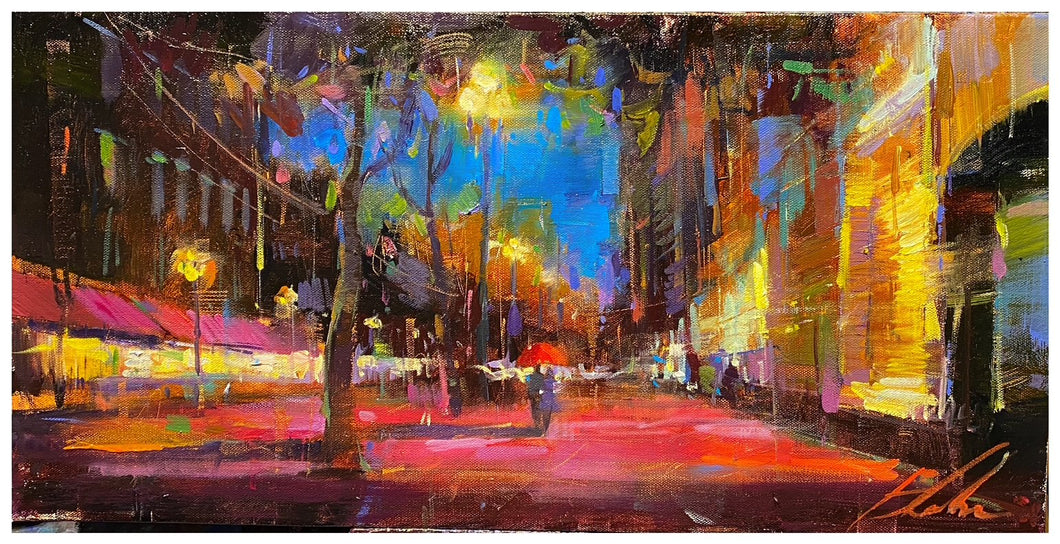 Original oil on canvas. Image measures 12 x 24 inches. Frame included.